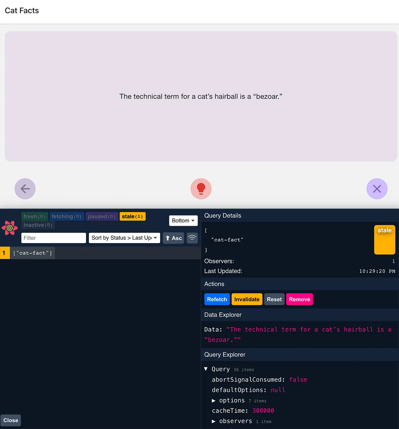 If you open my Expo app on the web by running nx start cats and choose the options Press w │ open web, you should be able to use the dev tools and see the state of my react queries:
