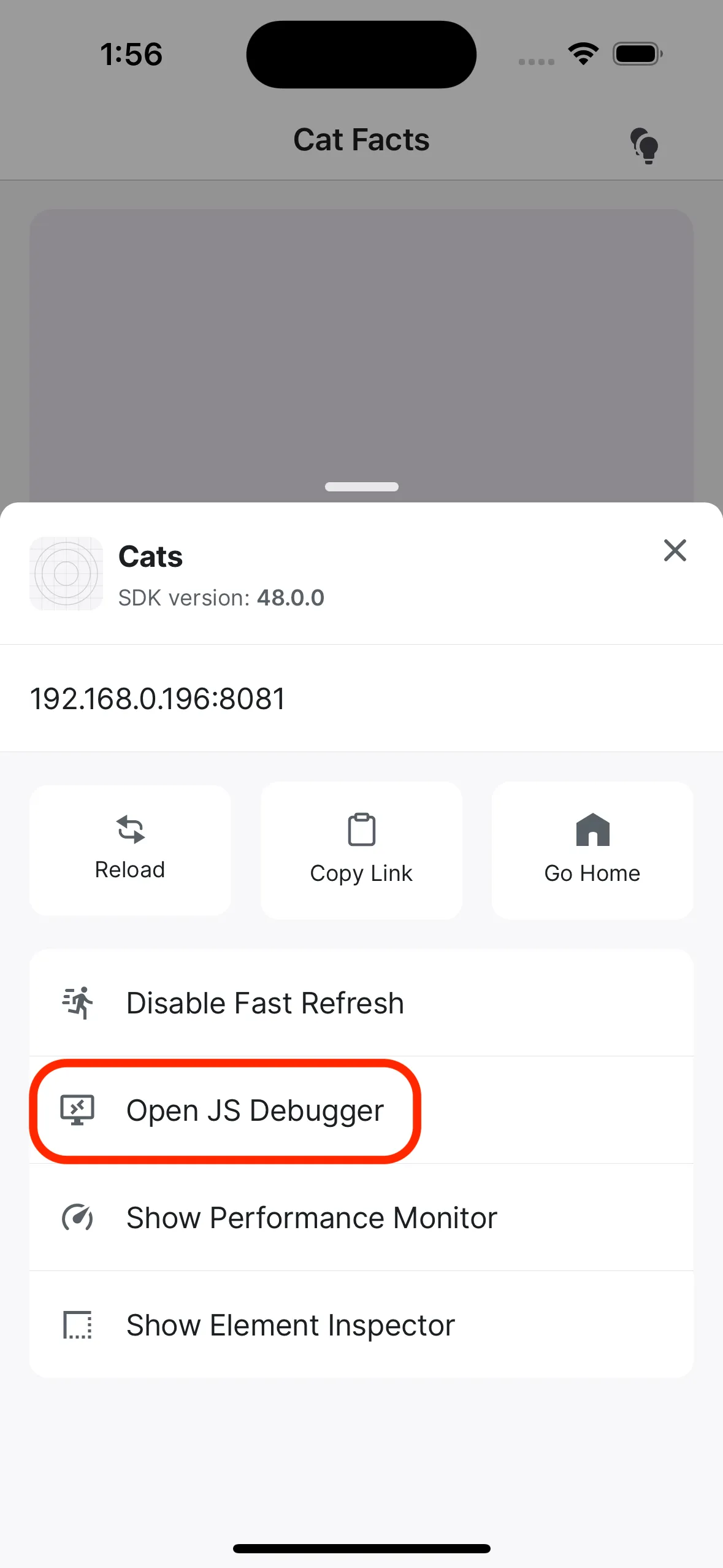 Or you can run npx nx serve cats to launch the app in web view. Then you can use Redux Devtools and debug the native app like a web app: